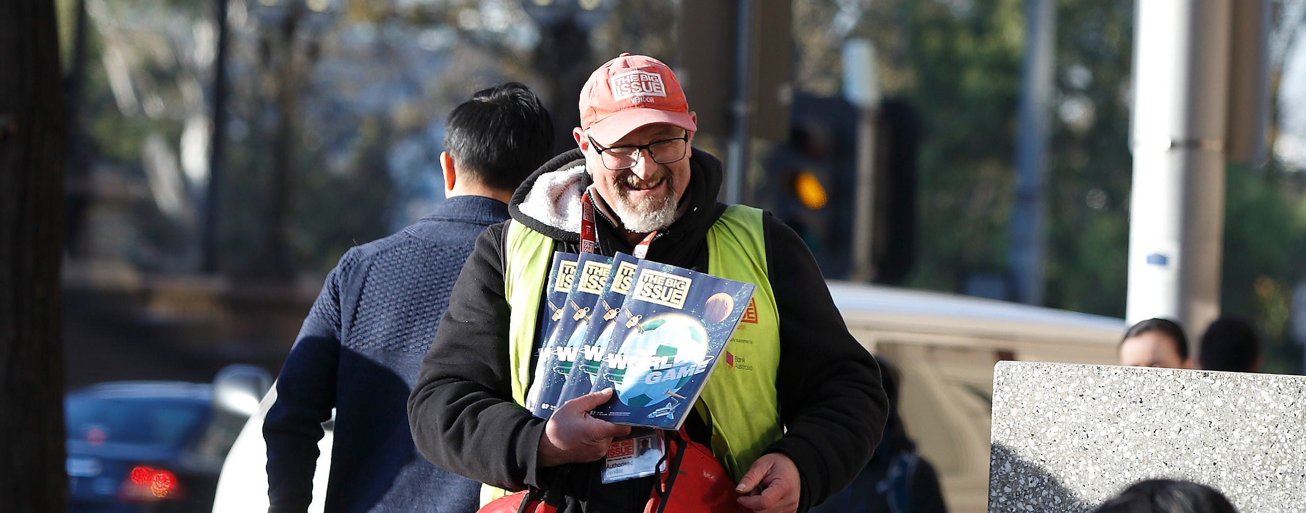 Editions of The Big Issue magazines available to purchase from the street vendors.Â